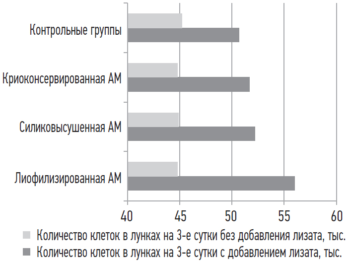 Все образцы амниона без добавления лизата БоТП не вызывали нарушения структурной целостности клеток и снижения их пролиферативной активности в течение всего срока культивирования. При витальном окрашивании в составе АМ, полученных путем силиковысушивания и лиофилизации, не было выявлено жизнеспособных клеток, в то время как в образцах криоконсервированной АМ можно было отчётливо видеть эпителиальные клетки с нормальной структурой ядер и цитоплазмы, секреторные везикулы выявлялись очень слабо или вообще не выявлялись. Независимо от способа консервирования, все образцы АМ не давали ростстимулирующего эффекта в культуре в течение всего срока наблюдения (см. рисунок).