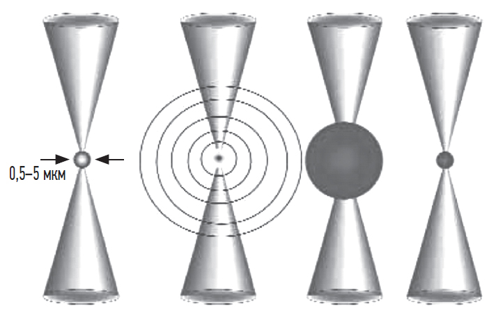 Рис. 1. Лазерный оптический пробой: плазма → расширение плазмы → кавитационная полость → газовый пузырь