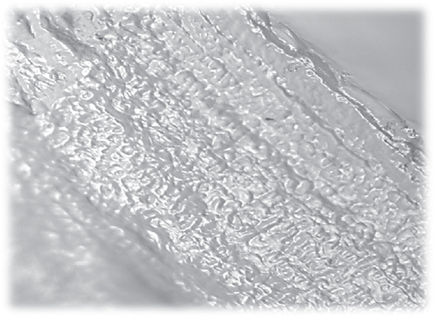 Изображения роговичной ткани, полученные после механического разделения её кератомом, демонстрируют иррегулярность поверхности (рис. 3). На всём протяжении разреза прослеживаются неравномерные микроборозды, что связанно с механическим продвижением в тканях роговицы и в ряде случаев с разрывом коллагеновых волокон, а не с их рассечением.