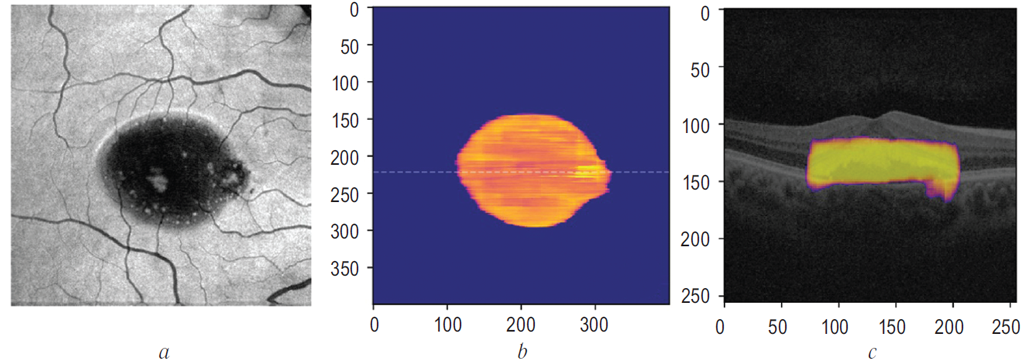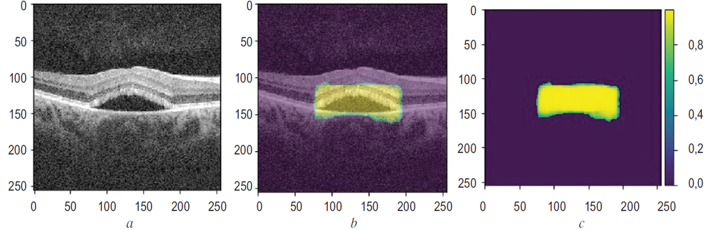 Рис. 1. Пример детекции обученной нейронной сетью субретинальной жидкости на индивидуальном В-скане: а — исходный В-скан; b — результат распознавания зоны скопления субретинальной жидкости; c — распределение вероятностной характеристики наличия субретинальной жидкости