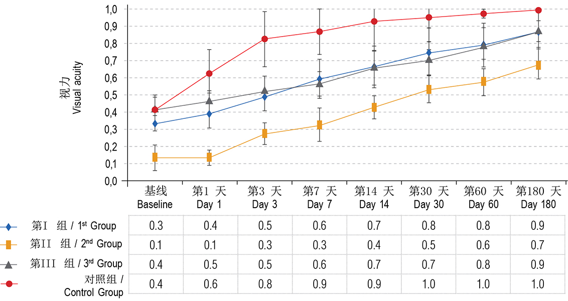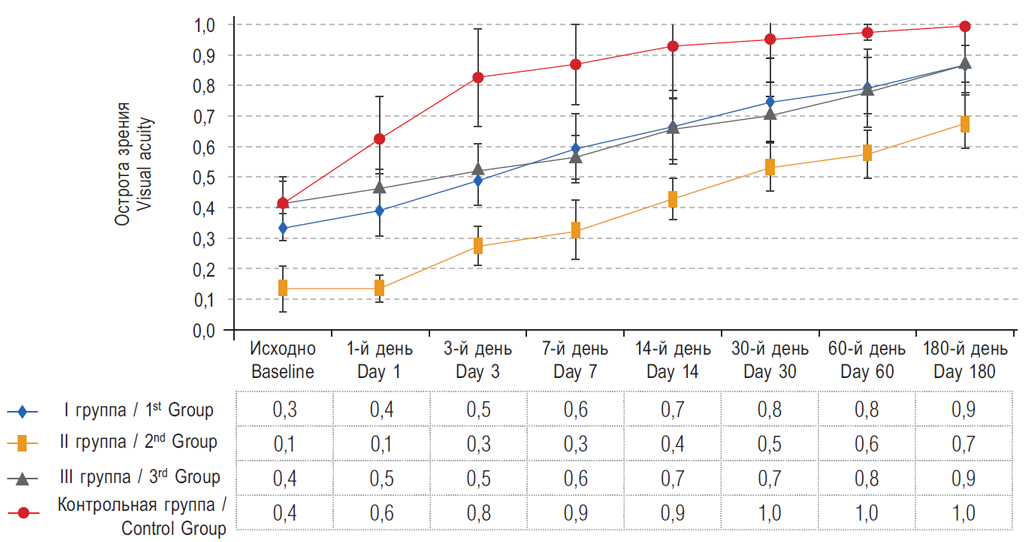Исследование остроты зрения и электрофизиологическое обследование проводили перед ВЭ и на 1, 3, 7, 14, 30, 60, 180-е сутки после хирургического вмешательства.