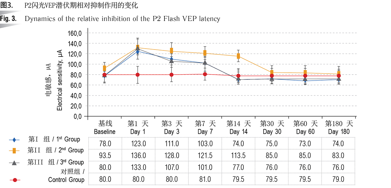 Fig. 3. Dynamics of the relative inhibition of the Р2 Flash VEP latency