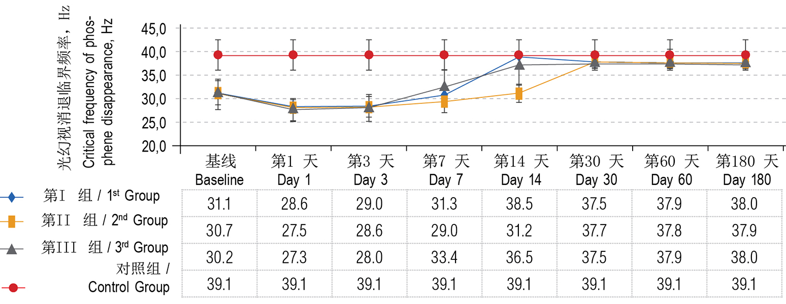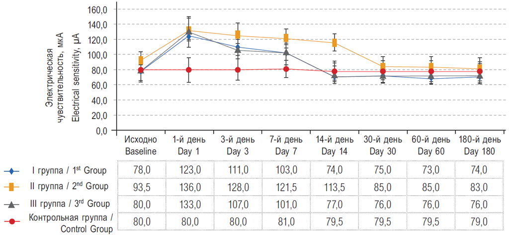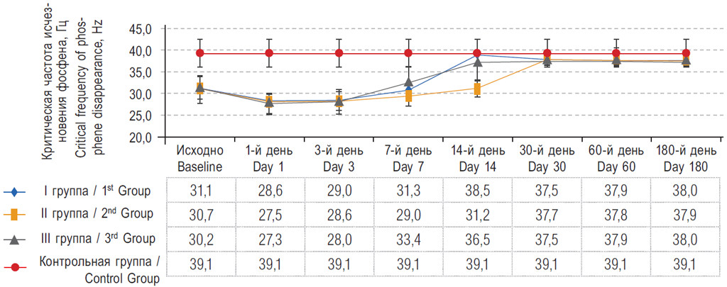 По данным исследования электрофосфена выявлено достоверное увеличение порога ЭЧ и КЧИФ на 1-е сутки после ВЭ по сравнению с исходными данными во всех трёх группах (рис. 4–7). С третьих суток после операции показатели ЭЧ и КЧИФ постепенно восстанавливались до нормальных значений. Нормализация показателей ЭЧ в I и III группах выявлена на 7-е сутки, во II группе — на 14-е сутки после операции. Показатели КЧИФ в I и III группах нормализовались на 14-е сутки, во II группе — на 30-е сутки после операции.