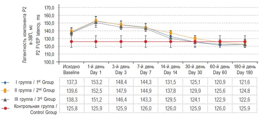 При анализе динамики показателей кинетики биоэлектрического импульса зрительного нерва выявлено достоверное увеличение (p < 0,001) временных параметров компонента Р2 в-ЗВП на 1-е сутки после операции во всех трёх группах (рис. 2, 3). С третьих суток после операции отмечалась тенденция к восстановлению скорости проведения нервного импульса по зрительному нерву. Кинетика нервного импульса в I и III группах достигала нормальных значений на 14-е сутки после ВЭ, во II группе — на 30-е сутки после операции.