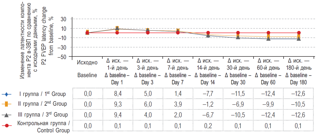 При сравнении изменения латентности компонента Р2 относительно исходного уровня (в %) на 1-е сутки после ВЭ выявлено отсутствие статистически достоверных различий между тремя основными группами, то есть угнетение функции нейронов внутренних слоёв сетчатки и зрительного нерва вследствие хирургического воздействия не зависит от вида тампонирующего стекловидную камеру агента. Изменение латентности компонента Р2 начиная с 3-го дня послеоперационного периода при тампонаде стекловидной камеры стерильным воздухом в I группе и при тампонаде стекловидной камеры сбалансированным солевым раствором в III группе достоверно меньше, чем при газовоздушной тампонаде во II группе. Значимость различий между этими показателями в группах сохранялась для компонента Р2 и на 14-е сутки послеоперационного периода.