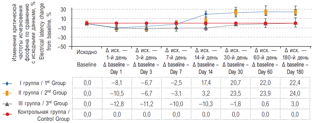 - электрофосфен: порог ЭЧ (мкА), относительное (в %) изменение порога ЭЧ, показатели КЧИФ (Гц), относительное (в %) изменение показателей КЧИФ.