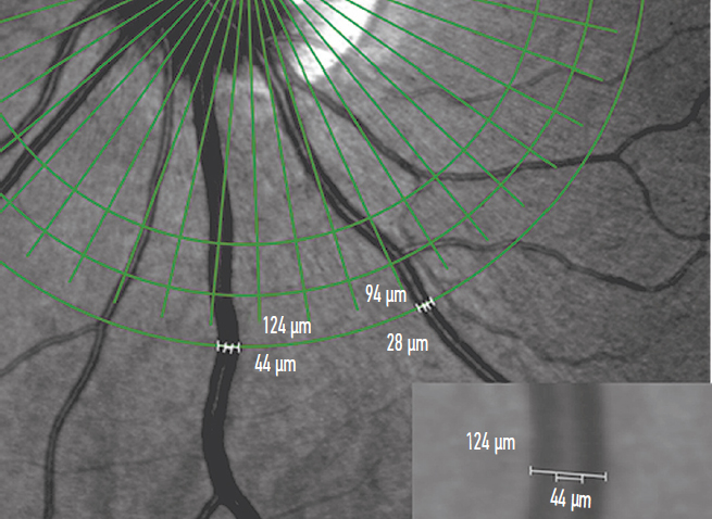 Рис. 1. Схема измерения диаметра сосудов и их просветов в нижневисочном квадранте правого глаза с помощью встроенных инструментов томографа на HRA-изображении
