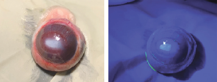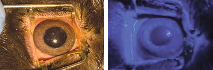 Исследование проводили в два этапа. На первом этапе всем животным воспроизводили модель экспериментальной ХПЭР при помощи ультрафиолетового излучения [5]. Для этого под биомикроскопическим контролем после предварительной анестезии выполняли тотальную деэпителизацию роговицы, а затем при помощи контактной диафрагмы (диаметр 4 мм) и длинноволновой ультрафиолетовой установки (длина волны 365 нм, мощность 90 Вт) осуществляли локальное облучение роговицы в течение 45 мин с расстояния 20 см.