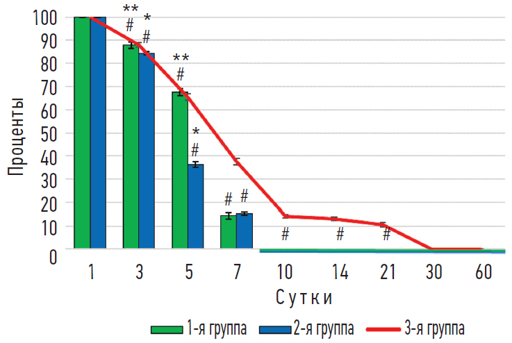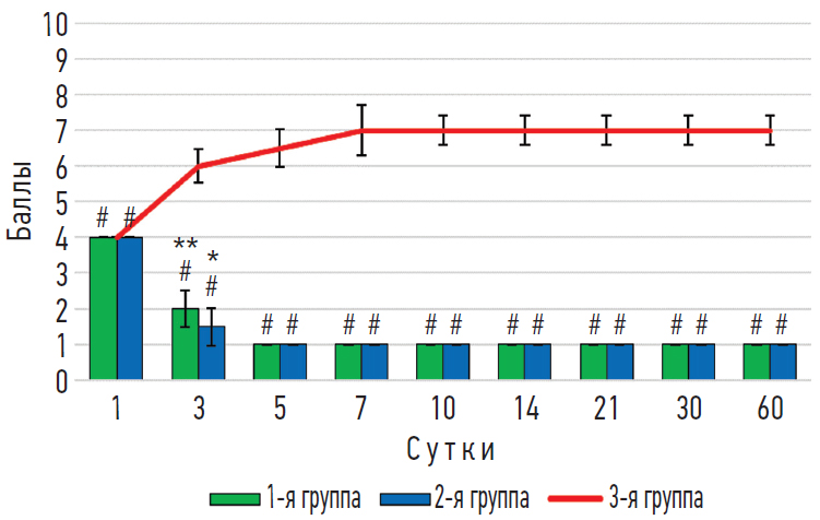 Рис. 5. Статистический анализ динамики деэпителизации роговиц. Метод медианного критерия Краскела – Уоллиса. * p < 0,05 при сравнении с 1-й группой; ** p < 0,05 при сравнении со 2-й группой; # p < 0,05 при сравнении с 3-й (контрольной) группой / Fig. 5. Statistical analysis of corneal clouding dynamics. The Kruskal–Wallis test. * p < 0.05 when compared with the 1st group; ** p < 0.05 when compared with the 2nd group; # p < 0.05 when compared with the 3rd (control) group