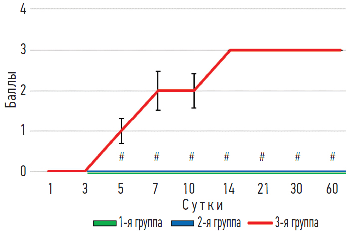 Рис. 6. Статистический анализ динамики васкуляризации роговиц. Метод медианного критерия Краскела – Уоллиса. # p < 0,05 при сравнении с 3-й (контрольной) группой / Fig. 6. Statistical analysis of corneal clouding dynamics. The Kruskal–Wallis test. # p < 0.05 when compared with the 3rd (control) group