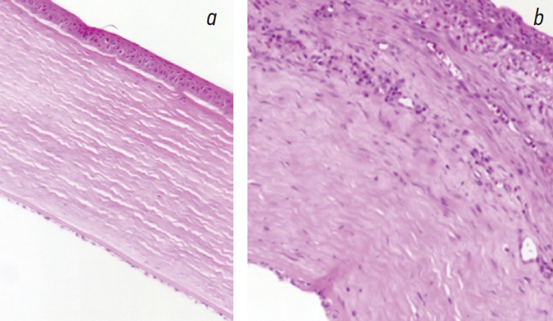 Рис. 7. Гистологическое исследование роговицы у животных на 30-е сутки: а — 1-й и 2-й групп; b — 3-й группы. Окраска гематоксилином и эозином. Увеличение ×200 / Fig. 7. Histologic study of the cornea in animals, Day 30: a — of the 1st and 2nd group; b — of the 3rd group. Hematoxylin and eosin staining (×200)