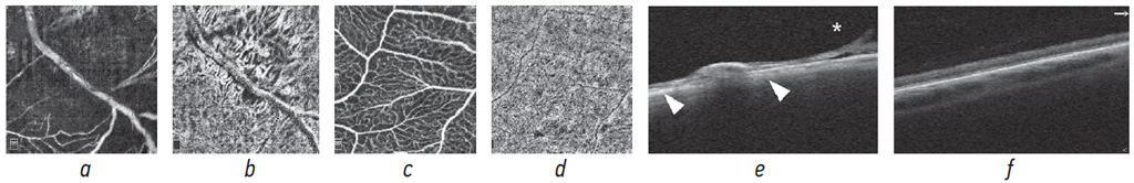 Рис. 1. Изображения оптической когерентной томографии (ОКТ) и ОКТ-ангиографии (ОКТА) сетчатки в области периферической хориоретинальной дегенерации (ПХРД) по типу «решётки» и области неизменённой сетчатки одного глаза: а — ОКТА-изображение (пласт на всю толщину сетчатки, отражающий все микроциркуляторное русло) в области ПХРД с полнослойной ретинальной неперфузией; b — ОКТА-изображение в области ПХРД (пласт хориокапилляров) с повышенной чёткостью визуализации и разреженностью хориокапилляров; c — ОКТА-изображение в области неизменённой сетчатки на периферии глазного дна с равномерным рисунком микроциркуляции и относительно низкой сосудистой плотностью; d — ОКТА-изображение (пласт на всю толщину сетчатки, отражающий всё микроциркуляторное русло) в области неизменённой сетчатки (пласт хориокапилляров) с равномерным рисунком без визуализации отдельных сосудов; e — структурный ОКТ-скан в области ПХРД с потерей слоистой структуры и истончением сетчатки в области ПХРД, а также витреоретинальной фиксацией (звездочка) и выраженным истончением сосудистой оболочки (стрелка); f — структурный ОКТ-скан в области неизменённой сетчатки с равномерной толщиной сетчатки с сохранением слоистой структуры и равномерной толщиной сосудистой оболочки