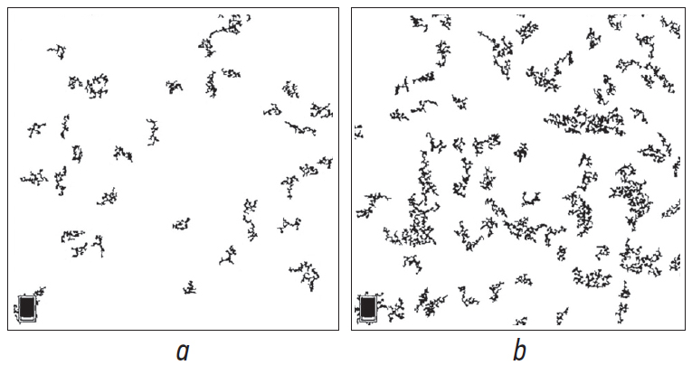 Рис. 3. Визуализация зон отсутствия сосудистого сигнала после обработки изображений оптической когерентной томографии-ангиографии хориокапилляров в макулярной зоне по методу Phansalkar: а — в глазу с периферической хориоретинальной дегенерацией по типу «решётки»; b — в глазу здорового добровольца