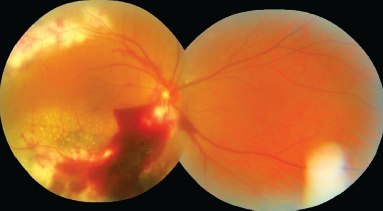 Поражение при ЦМВ-увеите было представлено хориоретинальными очагами с тенденцией к их слиянию, не имеющими чётких границ и округлых форм, нередко занимающими большие площади. Чаще всего встречались участки повреждённой ткани неправильной формы с выраженным перифокальным отёком, нередко распространяющиеся вдоль крупных сосудистых ветвей. На фотографии глазного дна одного из пациентов определяются перивазальные очаги с нечёткими контурами, отёк сетчатки, распространяющийся в сторону макулярной зоны, твёрдые экссудаты, преретинальные геморрагии, в том числе большой площади (рис. 1).