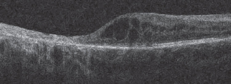 Рис. 2. Оптическая когерентная томография макулярной зоны пациента через 1 год после завершения этиотропного лечения