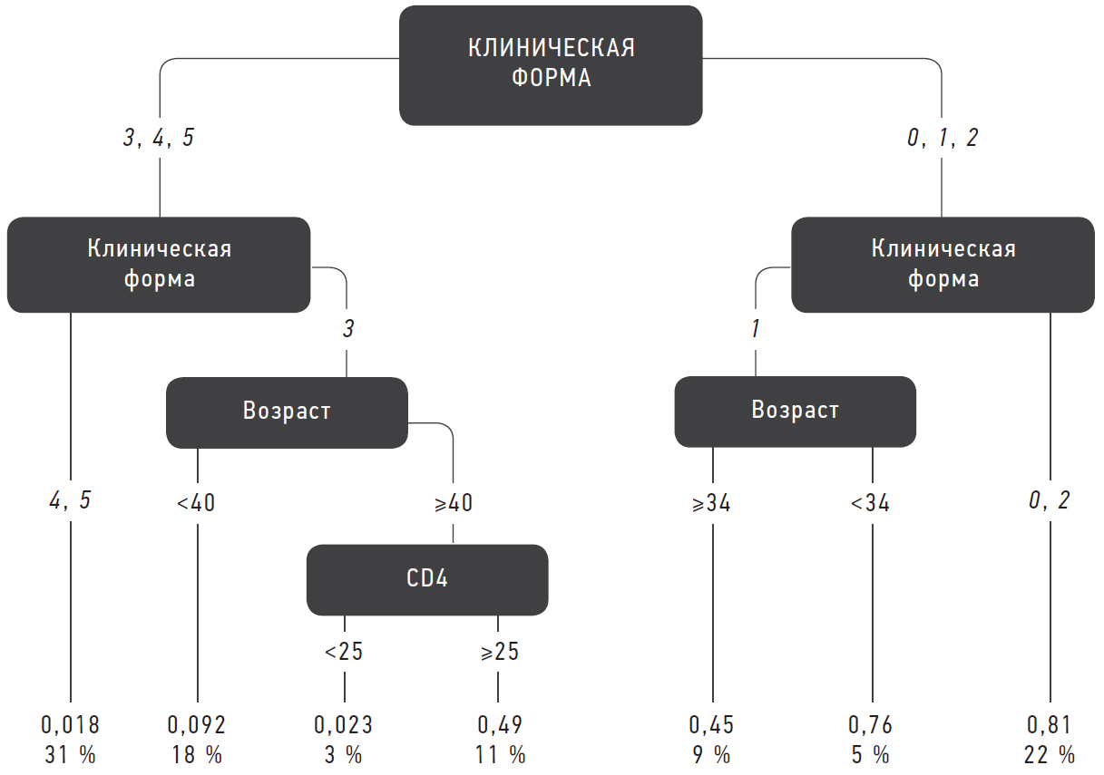 Ведущий регрессионный критерий — клиническая форма заболевания. Правый лист регрессионного дерева представлен локализованными формами и диффузным хориоретинитом периферической локализации. Прогнозируемая острота зрения будет в этом случае наиболее высокая (0,81). При изолированном поражении центральной области сетчатки важным становится возраст: пациенты моложе 34 лет имеют лучший зрительный прогноз. Левый лист регрессионного дерева представлен диффузными и генерализованными формами. При панувеите, а также при диффузном нейрохориоретините с поражением макулы острота зрения составляет 0,018. При диффузных хориоретинитах, захватывающих центральную ямку, больные старше 40 лет имеют благоприятный зрительный прогноз при уровне CD4-лимфоцитов в крови более 25 клеток/мкл. В этих случаях острота зрения может достигнуть 0,49. Более молодые пациенты или пациенты с более низким содержанием CD4-лимфоцитов будут иметь остроту зрения 0,092 и 0,023 соответственно.