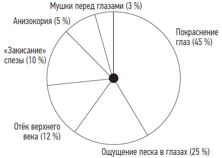 Кроме эпифоры (в 100 % случаев), обследованные пациенты предъявляли ещё целый ряд дополнительных жалоб со стороны органа зрения (рис. 1).
