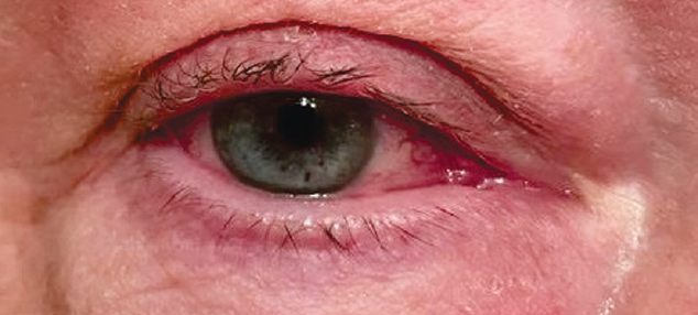 Пациент, 67 лет. Периодическое слезотечение и покраснение справа появилось через 5 дней от начала COVID-инфекции (рис. 4), через 2 нед. такие же жалобы появились на левом глазу. Самостоятельно стал закапывать непродолжительно и нерегулярно сульфацил натрия 20 % — без эффекта. К офтальмологу обратился через 3 мес. после выздоровления от COVID-19, когда слезотечение стало постоянным и на улице, и в помещении (больше справа).