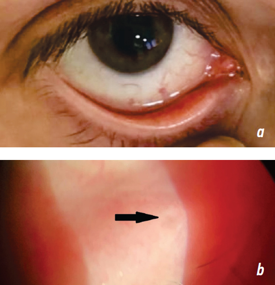 Рис. 6. Заращение нижнего слёзного канальца: а — общий вид правого глаза; b — нижняя слёзная точка правого глаза (указана стрелкой)