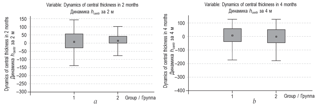 Fig. 2. Dynamics of the central retinal thickness after high-density microphotocoagulation and after high-density subthreshold laser coagulation: a – in 2 months; b – in 4 months