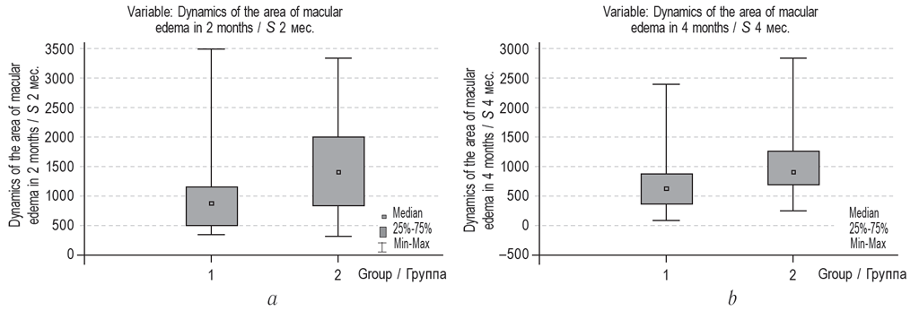 Рис. 3. Динамика площади макулярного отёка после микрофотокоагуляции высокой плотности и субпороговой лазерной коагуляции высокой плотности: a — через 2 месяца; b — через 4 месяца