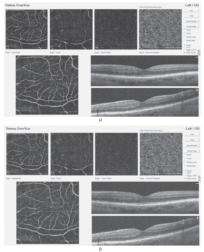 Рис. 4. Результаты ОКТ-ангиографии после выполнения субпороговой лазерной коагуляции высокой плотности: а — до лечения; b — через 1 месяц