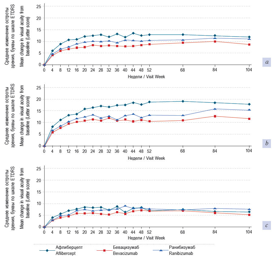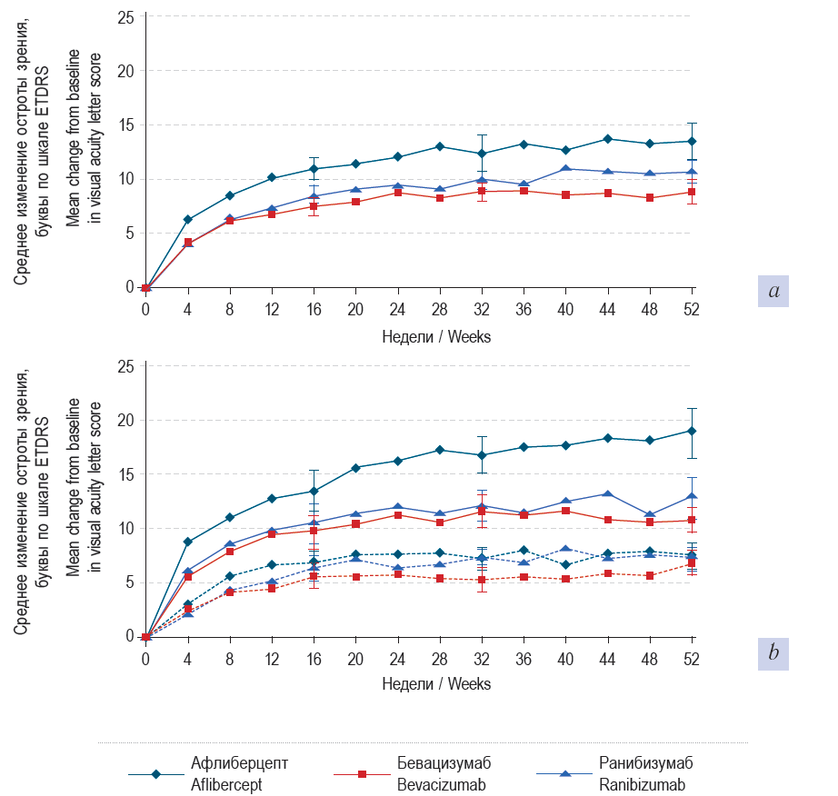 Long-term outcomes after 5 years of therapy will probably show more significant differences between groups in favor of aflibercept or ranibizumab. However, at the moment, the results of Protocol T indicate that ranibizumab and aflibercept have comparable effectiveness after 2 years of therapy, despite the initial superiority of aflibercept in achieving a functional effect. This will allow the treatment options in this group to be expanded to recommend both drugs, though with preference given to aflibercept for patients who have a low initial VA.