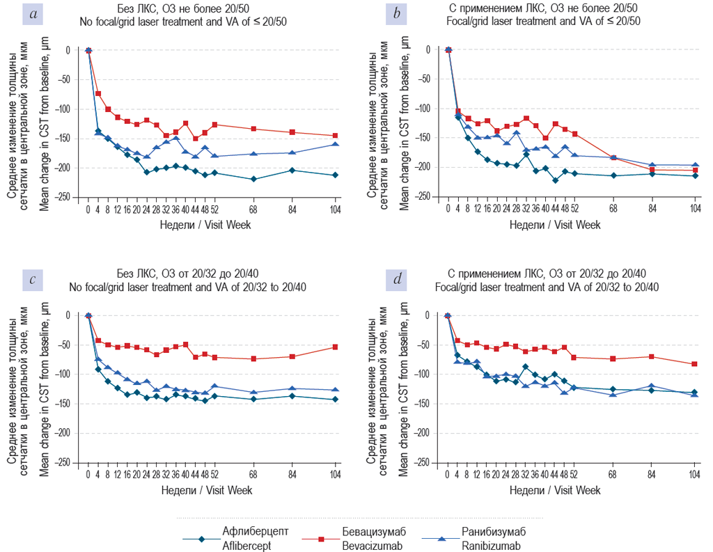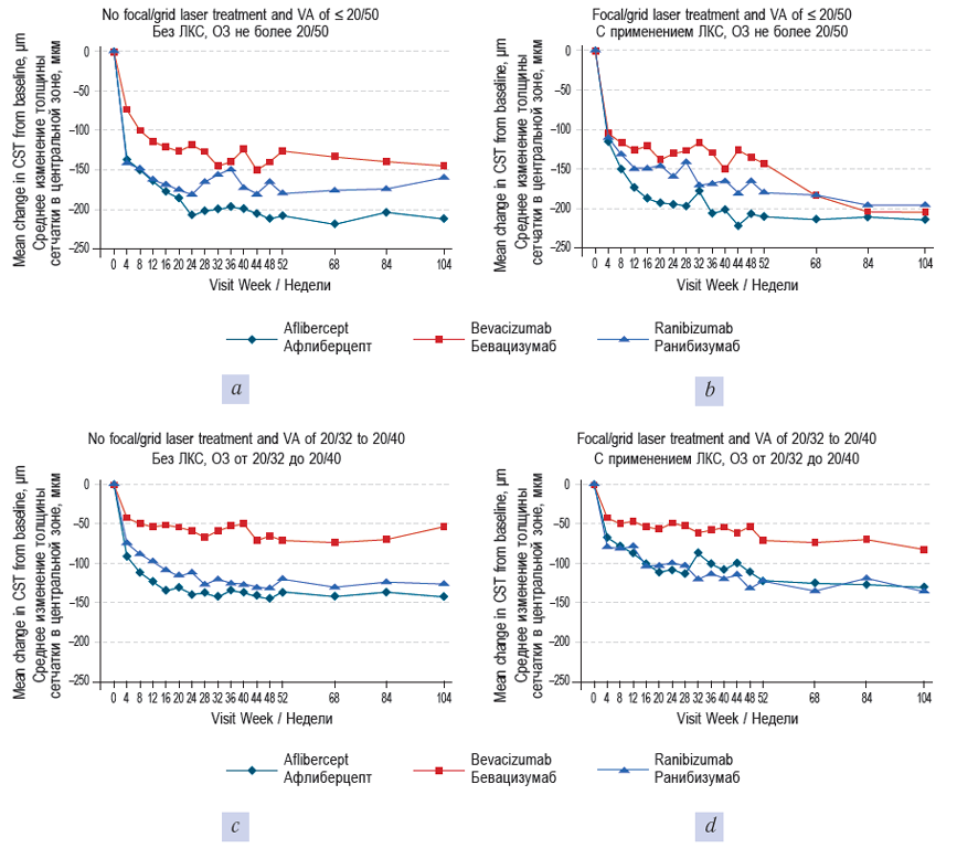 Рис. 3. Изменение средней толщины сетчатки в когортах с различной исходной остротой зрения и невыполненной ЛКС (а, с) или выполненной ЛКС (в, d) (Jampol LM, Glassman AR, Bressler NM. Anti-Vascular Endothelial Growth Factor Comparative Effectiveness Trial for Diabetic Macular Edema: Additional Efficacy Post Hoc Analyses of a Randomized Clinical Trial. JAMA Ophthalmol. 2016;134(12) [49])