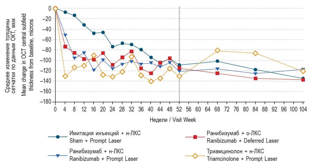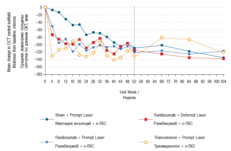 Regarding other research by the DRCR.net Research Group, we should comment on Protocol I, which assessed the efficacy of ranibizumab in combination with LCR (immediate and delayed), triamcinolone acetonide with immediate LCR, and isolated laser treatment for the treatment of DME. This was a multicenter, randomized, double-blind, comparison study of 854 eyes from 691 patients with decreased VA (20/32 to 20/320) and DME involving the center of the macula (77% of patients completed the five-year follow-up). Patients were randomly divided into four cohorts: 1) ranibizumab plus immediate LCR, 2) ranibizumab plus delayed LCR, 3) sham injections plus immediate LCR; and 4) intravitreal triamcinolone acetonide 4 mg plus immediate LCR. Triamcinolone acetonide is not approved for ophthalmological use in the Russian Federation, but is used off-label. The last two groups could receive ranibizumab after 74 weeks for refractory DME or deterioration in visual function [51, 52].