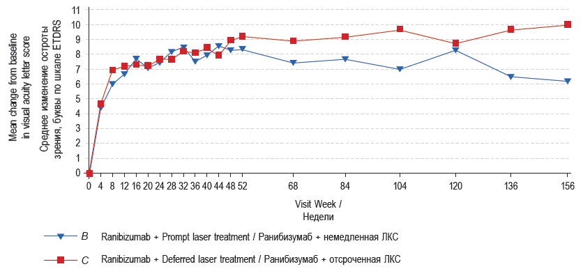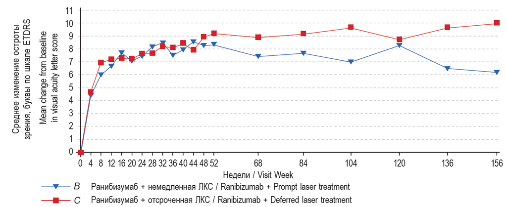 Рис. 5. Протокол I (трёхлетний период наблюдения). Изменение остроты зрения по шкале ETDRS в когортах с немедленной и отсроченной лазеркоагуляцией сетчатки. Количество глаз в группах за три года составило 165–144 в когорте с немедленной ЛКС, 173–147 в когорте с отсроченной ЛКС (Diabetic Retinopathy Clinical Research Network. Intravitreal Ranibizumab for Diabetic Macular Edema with Prompt vs Deferred Laser Treatment: 3-year Randomized Trial Results. Ophthalmology. 2012;119(11):2312-2318 [54])