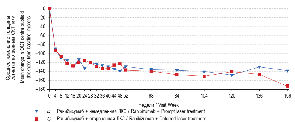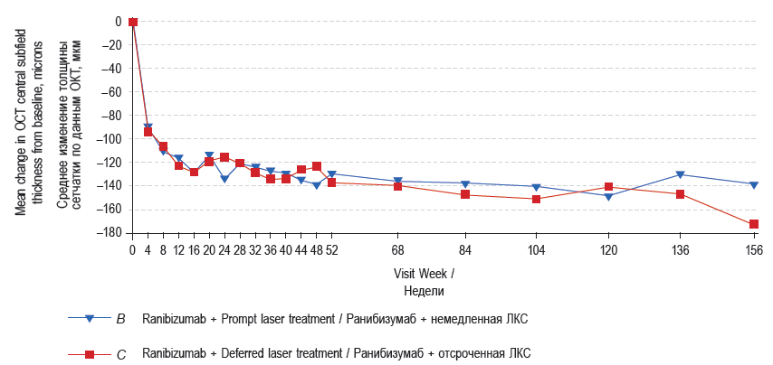 Рис. 6. Протокол I (трёхлетний период наблюдения). Изменение средней толщины сетчатки в макулярной зоне в когортах с немедленной и отсроченной лазеркоагуляцией сетчатки. Количество глаз в группах за три года составило 165–131 в когорте с немедленной ЛКС, 169–128 — в когорте с отсроченной ЛКС (Diabetic Retinopathy Clinical Research Network. Intravitreal Ranibizumab for Diabetic Macular Edema with Prompt vs Deferred Laser Treatment: 3-year Randomized Trial Results. Ophthalmology. 2012;119(11):2312-2318 [54])