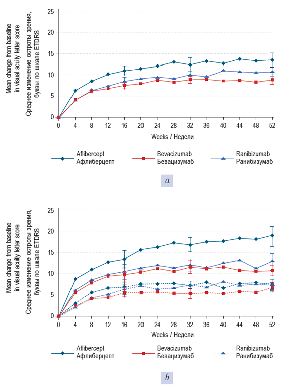 Рис. 1. Протокол T DRCR.net. Среднее изменение остроты зрения в группах: а — значения в общей когорте; b — значения в когортах в зависимости от остроты зрения. Сплошные линии иллюстрируют остроту зрения в когортах с исходной остротой зрения не более 20/50; пунктирные линии иллюстрируют когорты с остротой зрения от 20/32 до 20/40. Количество глаз в группах за срок наблюдения составило 195–244 в группе афлиберцепта, 188–218 в группах ранибизумаба и бевацизумаба. Планки погрешностей указывают 95 % доверительный интервал (Wells JA, Glassman AR, Ayala AR, et al. Aflibercept, Bevacizumab, or Ranibizumab for Diabetic Macular Edema. N Engl J Med. 2015;372(13):1193-1203 [47])