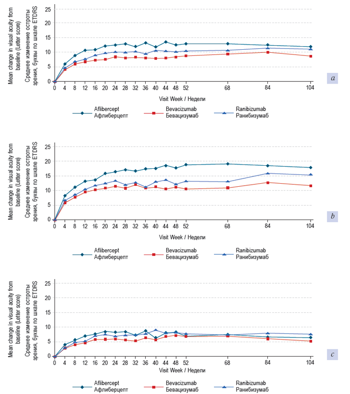 Рис. 2. Среднее изменение остроты зрения с коррекцией в группах Протокола T (два года от начала исследования): а — значения в общей когорте; b — значения в когорте с исходной остротой зрения не более 20/50; с — значения в когорте с исходной остротой зрения от 20/32 до 20/40. Количество глаз в группах за срок наблюдения составило 195–244 в группе афлиберцепта, 185–218 в группе бевацизумаба, 188–218 в группе ранибизумаба. Планки погрешностей указывают 95 % доверительный интервал (Wells JA, Glassman AR, Ayala AR, et al. Aflibercept, Bevacizumab, or Ranibizumab for Diabetic Macular Edema: Two-Year Results from a Comparative Effectiveness Randomized Clinical Trial. Ophthalmology. 2016;123:1351-1359 [48])