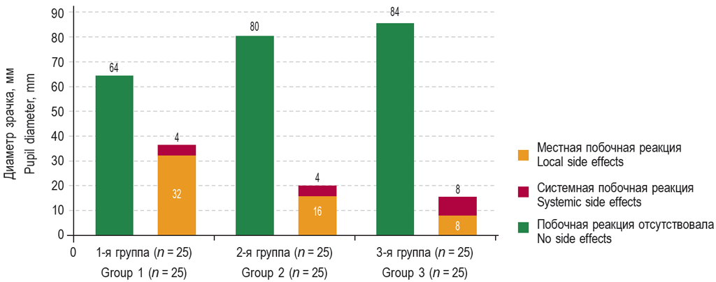 Таким образом, среди нежелательных явлений, связанных с однократной инстилляцией фиксированной комбинации 5 % фенилэфрина и 0,8 % тропикамида, чаще всего у исследуемых детей наблюдалась кратковременная местная реакция (периорбитальное побледнение кожных покровов), не ухудшающая общее соматическое состояние. Системные побочные эффекты —брадикардию (2,7 %), снижение артериального давления (2,7 %) и повышенное слюноотделение (2,7 %) — регистрировали в единичных случаях в течение первых двух часов наблюдения. В то же время нарушения дыхания, колебания сатурации и расстройства со стороны желудочно-кишечного тракта не установлены.
