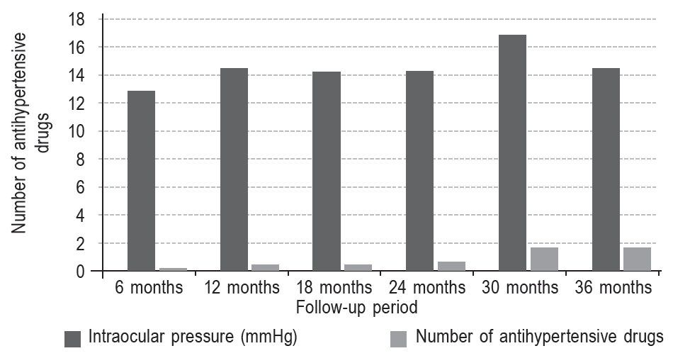 At the end of the second year of follow-up, the IOP in five cases was normal without the use of antihypertensive drugs. One antihypertensive drug was prescribed to one patient to normalize IOP. In five cases, the pressure was normalized using two drugs (Fig. 1). In the third year of follow-up, the IOP remained within the target values in four out of five patients. In one case, to stabilize the IOP values, a second DLTC was performed, which led to the normalization of intraocular pressure.