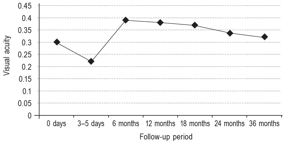 In the long term after surgery, visual acuity worsened in four cases. Three of them were due to cataract progression. Phacoemulsification was performed in these patients, which improved their visual acuity. In one case, visual impairment was associated with the progression of glaucoma. During follow-up, this patient underwent DLTC twice, which stabilized the process. In most cases, drainage device implantation not only preserved visual function, but also improved it to some extent (Fig. 2).