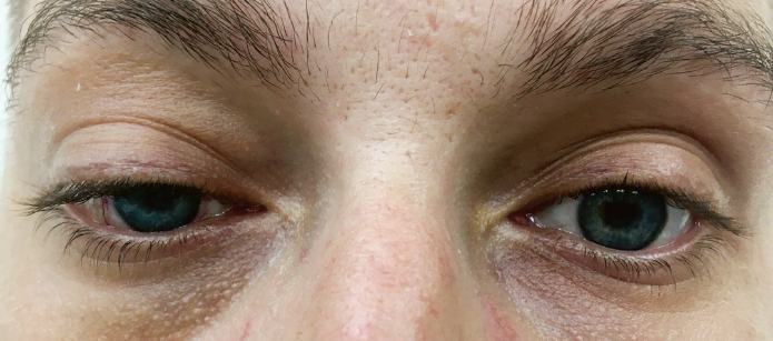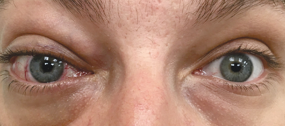 Fig. 2. Right-sided proptosis. Edema of the eyelids. Dilated episcleral vessels