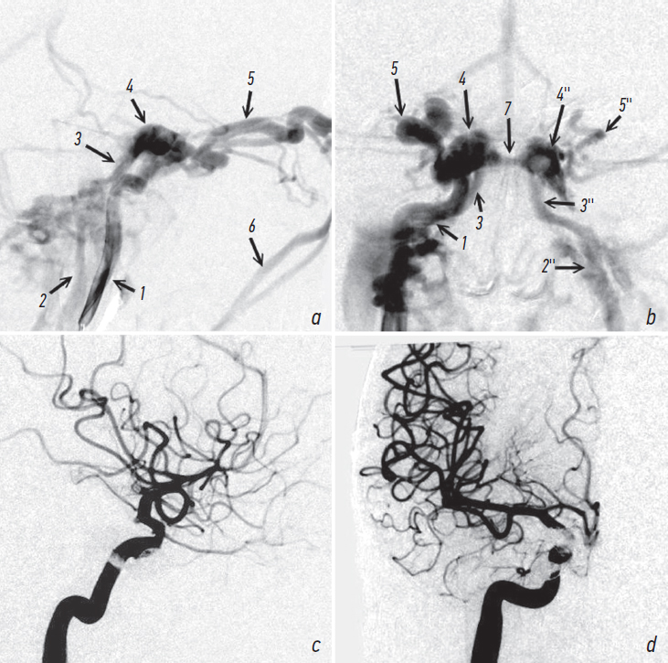 Рис. 5. Посттравматическое каротидно-кавернозное соустье справа. Ангиография правой внутренней сонной артерии до (а, b) и после эндоваскулярной операции (c, d) — полное разобщение фистулы. 1 — правая внутренняя сонная артерия; 2, 2'' — правая и левая внутренние яремные вены соответственно; 3, 3'' — правый и левый нижние каменистые синусы; 4, 4'' — правый и левый кавернозные синусы; 5, 5'' — правая и левая верхние глазные вены; 6 — правая лицевая вена; 7 — задний межкавернозный синус
