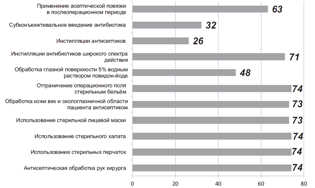 Ответы на вопрос о меропрятиях, направленных на профилактику инфекционно-воспалительных осложнений, представлены на рис. 1. Все опрошенные (74; 100 %) назвали антисептическую обработку рук хирурга, использование стерильных перчаток и халата, а также ограничение операционного поля стерильным бельём. Используют стерильную лицевую маску, а также обработку кожи век и окологлазничной области пациента антисептиком 73 хирурга (98,6 %). Применяют инстилляции антибиотиков широкого спектра действия 95,9 % опрошенных (71 человек), существенно реже упоминались обработка глазной поверхности 5 % водным раствором повидон-йода (48; 64,9 %), субконъюнктивальное введение антибиотика (32; 43,2 %) и инстилляции антисептиков (26; 35,1 %). Применение асептической повязки в послеоперационном периоде отметили 63 респондента (85,1 %).