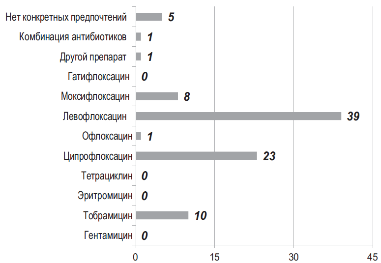 На вопросы, касающиеся применения местных инстилляционных (топических) антибиотиков, было предложено ответить только тем респондентам, кто их использует. На вопрос «Если Вы используете инстилляции антибиотиков, то какому препарату отдаёте предпочтение?» ответили 72 человека (результаты представлены на рис. 2). Наиболее часто упоминались левофлоксацин (54,2 %), ципрофлоксацин (31,9 %) и тобрамицин (13,9 %). Пять опрошенных (6,9 %) заявили об отсутствии конкретных предпочтений, а ещё один (1,4 %) сообщил, что использует комбинацию препаратов. В качестве альтернативы предложенным вариантам ответов один респондент (1,4 %) указал ванкомицин.