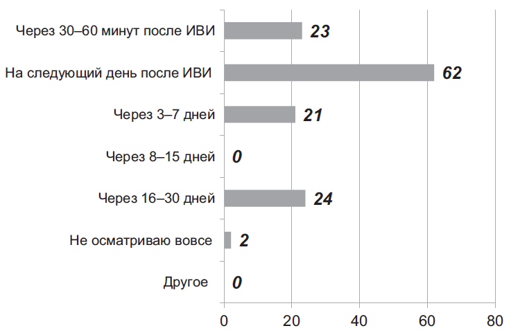 Рис. 3. Сроки осмотров пациентов после интравитреальных инъекций (ИВИ) (n = 74, в 38 анкетах указано более одного варианта ответа)