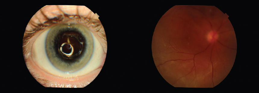 Fig. 1. Patient S., 57 years. Right eye: no signs of inflammation. Pseudophakia, operated regmatogenous retinal detachment, the state after cerclage and additional scleral buckling. Non-adherence of the retina in the lower segments remains. RE VA = 0.1. Duration of the observation period – more than 3 years