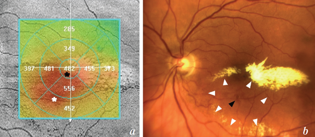 Рис. 4. Топографическое распределение экссудативных признаков у пациента с ретинальной артериальной макроаневризмой. Карта толщины сетчатки (a) демонстрирует увеличение толщины сетчатки по направлению от центра макулы к ретинальной артериальной макроаневризме, максимальная толщина сетчатки (чёрная звездочка) в пределах центральной подзоны — 450 мкм, максимальная толщина сетчатки в области ретинальной артериальной макроаневризмы (белая звёздочка) — 525 мкм. Цветная фотография глазного дна демонстрирует перифокальное по отношению к ретинальной артериальной макроаневризме (чёрная стрелка) распределение твёрдого экссудата (белые стрелки) (b)
