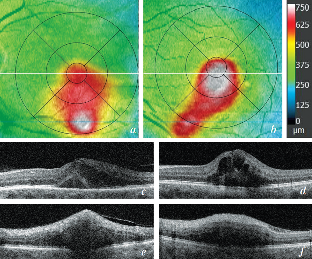 The significance of the application of the OCT differentiation algorithm in RAM and BRVO lies in not only the differential diagnosis between RAM and macular BRVO, which have similar ophthalmoscopic presentation, but also the identification of secondary macroaneurysms (possibly, large microaneurysms) if combined with BRVO. This will also reduce the need for FA in this cohort of patients and aid in planning navigational laser coagulation, which has been shown to be effective [15]. In this case, the target of laser coagulation may be an eccentric peak of thickening of the retina, presumably hiding macroaneurysms. All these patterns can be extrapolated to microaneurysms in diabetic retinopathy if diffuse exudation is absent or poorly expressed. There should, indeed, be no significant difference in the pattern of the distribution of exudative signs between one macroaneurysm and a group of microaneurysms localized in a limited area and a single relatively large microaneurysm.