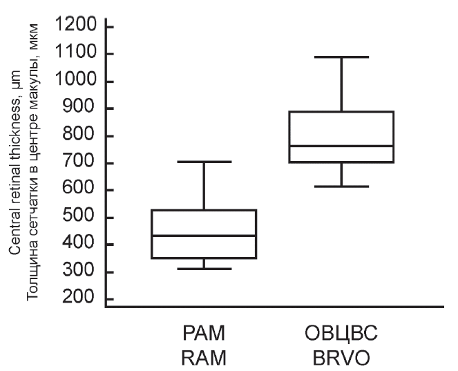 Рис. 2. Толщина сетчатки в центре макулы у пациентов с ретинальными артериолярными макроаневризмами и макулярными окклюзиями ветвей центральной вены сетчатки: РАМ — ретинальная артериальная макроаневризма; ОВЦВС — окклюзия ветвей центральной вены сетчатки