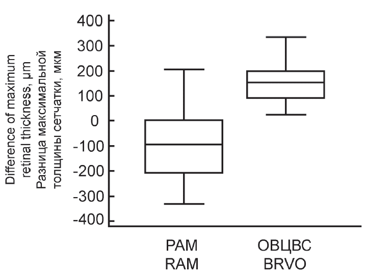 Рис. 3. Разница толщины сетчатки в центре макулы и суррогатной контрольной точке у пациентов с ретинальными артериолярными макроаневризмами и макулярными окклюзиями ветвей центральной вены сетчатки: РАМ — ретинальная артериальная макроаневризма; ОВЦВС — окклюзия ветвей центральной вены сетчатки