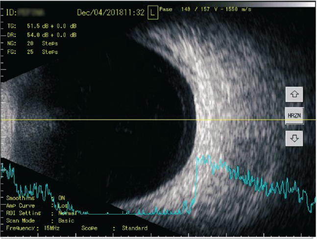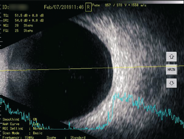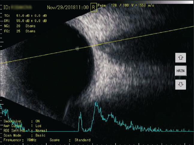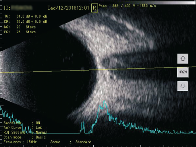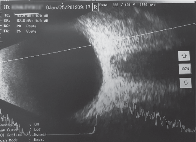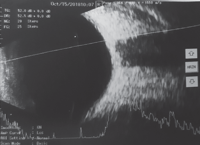 Рис. 5. A- и B-сканирование пациентки Р. при первичном обращении. В-скан: аксиальная горизонтальная проекция, умеренное количество помутнений в стекловидном теле. А-скан: 6 пиков средней и низкой эхогенности