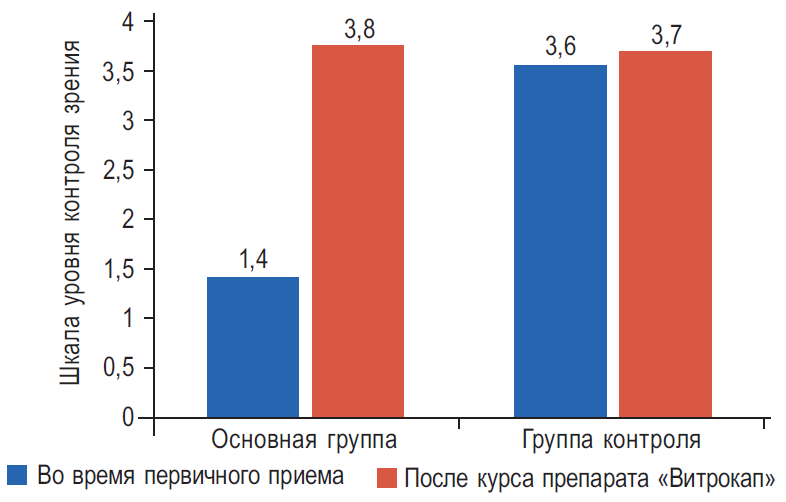 На основании анализа жалоб по условной шкале уровня комфорта зрения после прохождения курса лечения препаратом «Витрокап» у пациентов основной группы уровень комфорта зрения на фоне доминирующей жалобы на помутнения повысился более чем в два раза (рис. 1). В группе контроля значительных изменений не наблюдалось, так как уровень комфорта зрения был изначально высоким (см. рис. 1).