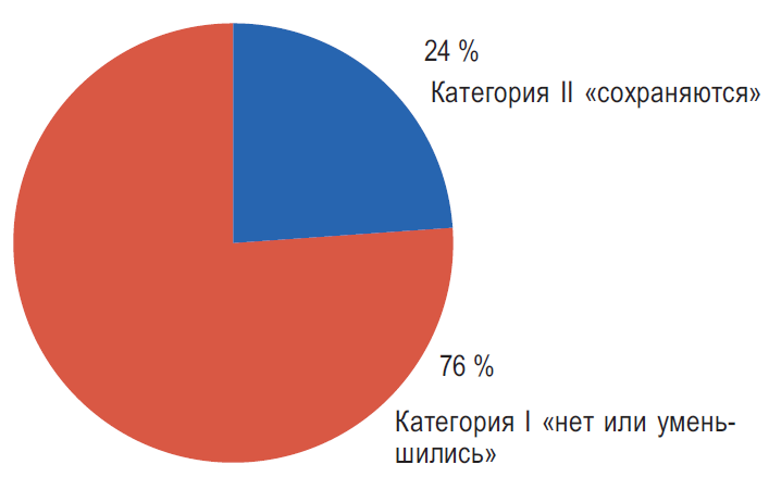 Оценивая качество жалоб на мушки перед глазами по категориям I и II, следует отметить, что в большинстве случаев (76 %) пациенты сообщали об уменьшении или отсутствии помутнений перед глазами (категория I) после прохождения курса лечения (рис. 2).