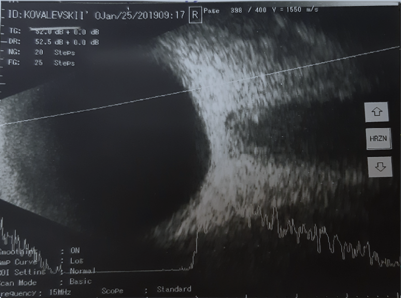 При интерпретации А-сканограммы оценивали количество эхопиков, соответствующих числу видимых помутнений СТ на В-сканограмме, а также высоту и силу эхосигнала помутнений — параметр, который коррелирует с их гистологическим строением.